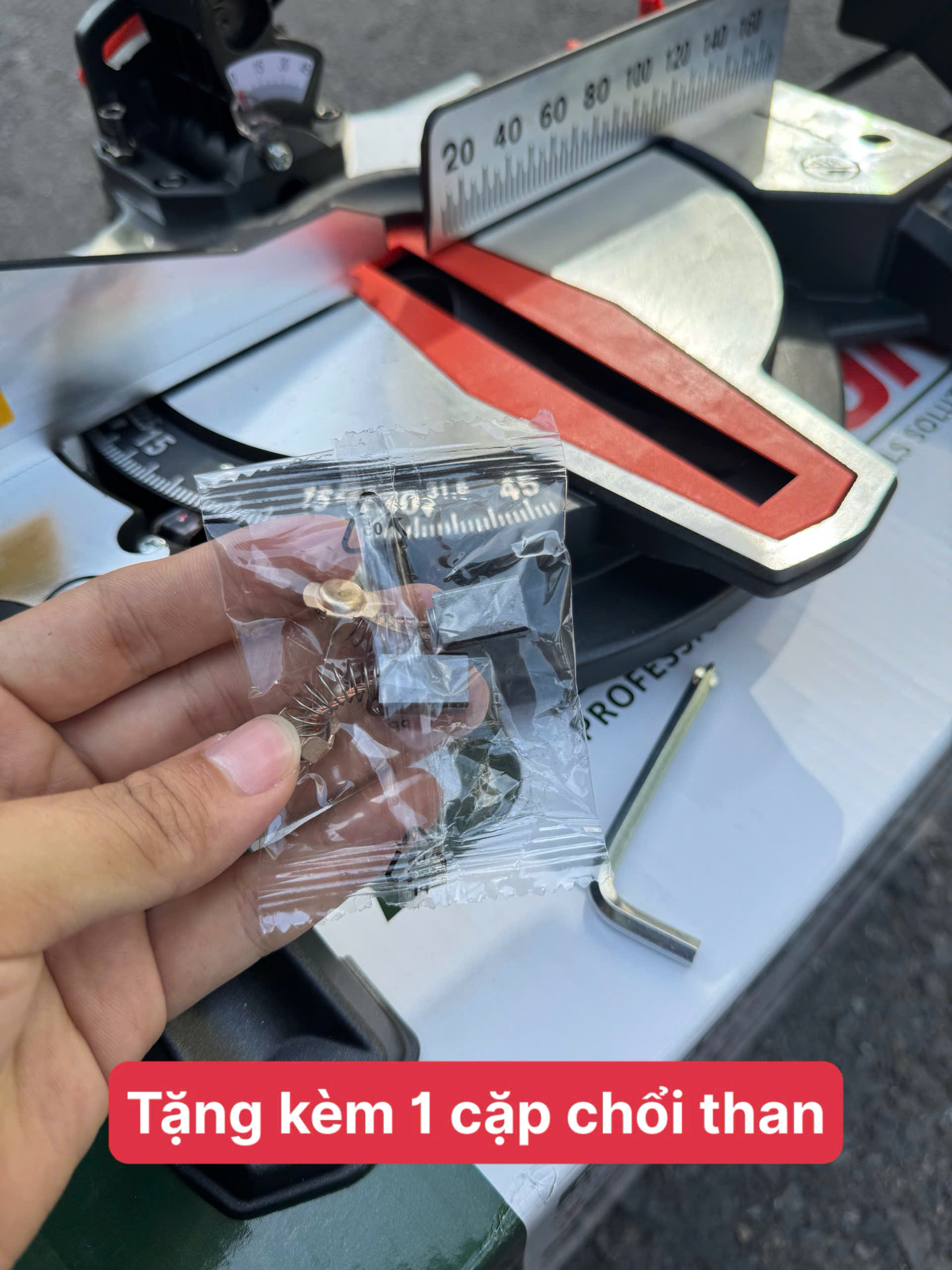 👉 Phụ kiện đi kèm gồm: 1 kẹp giữ vật liệu, 2 thanh đỡ vật liệu, 1 mở nhanh và 1 túi đựng bụi.